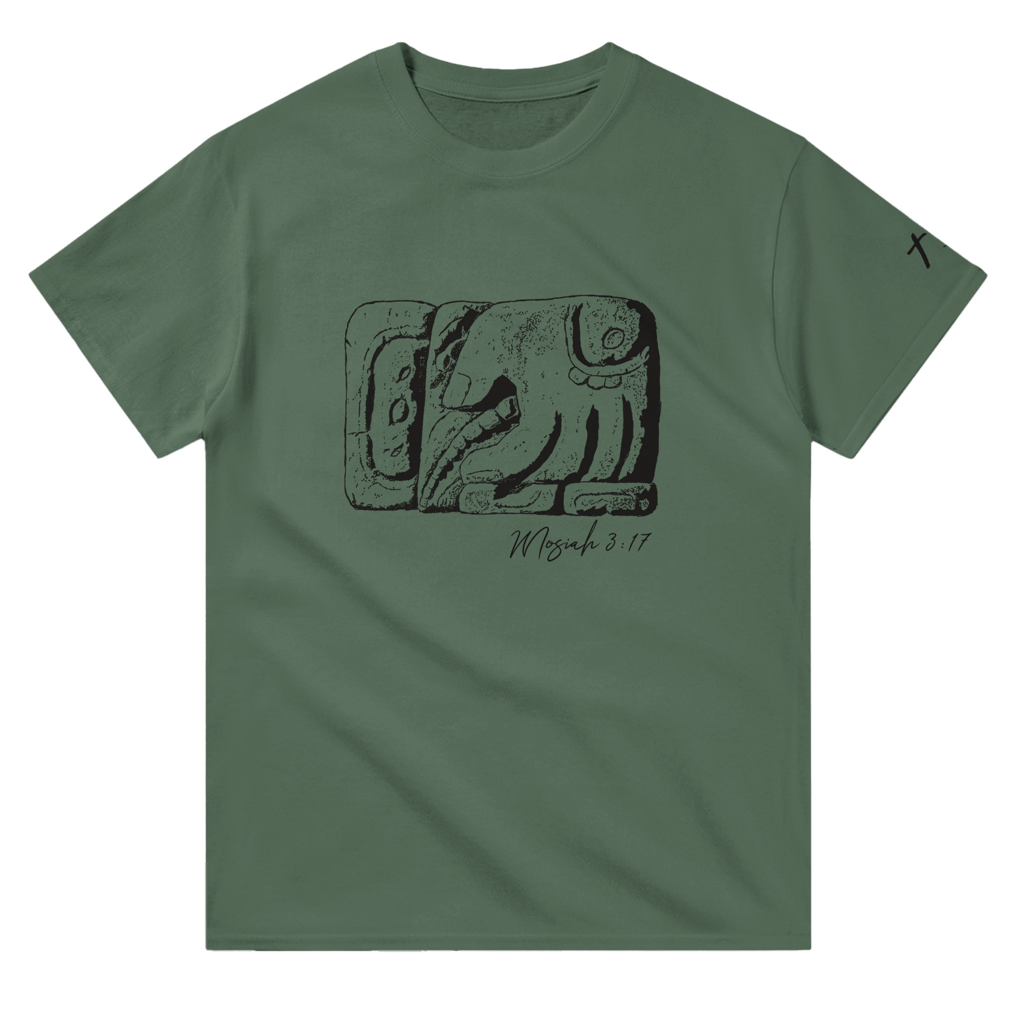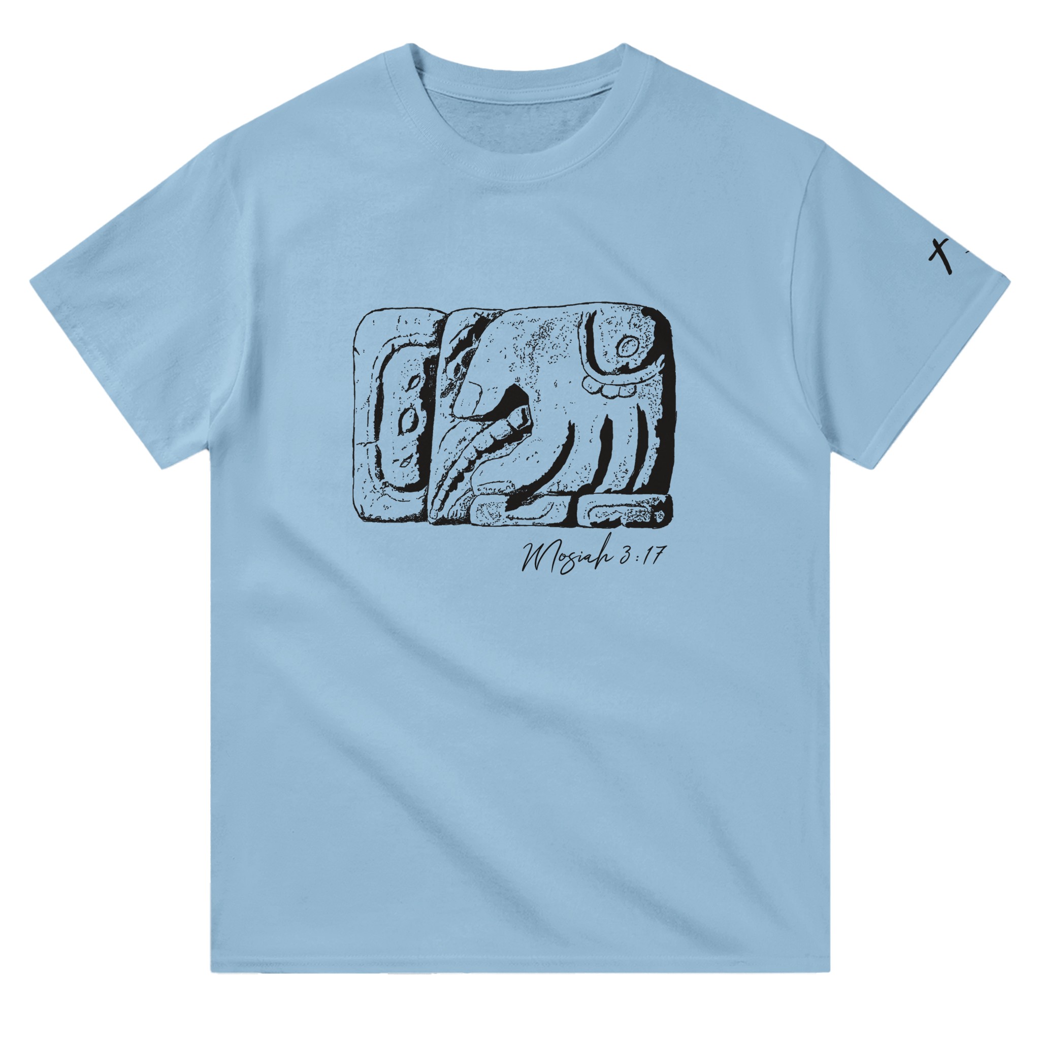 Featuring the Mayan Glyph “Ku’ul” which has been translated as “he scattered blood” and a reference to Mosiah 3:17, this shirt is a great way to show your love for Christ, the Book of Mormon, and Book of Mormon archeology. The left sleeve also has the reformed Egyptian characters meaning “Christ’s tribe”
